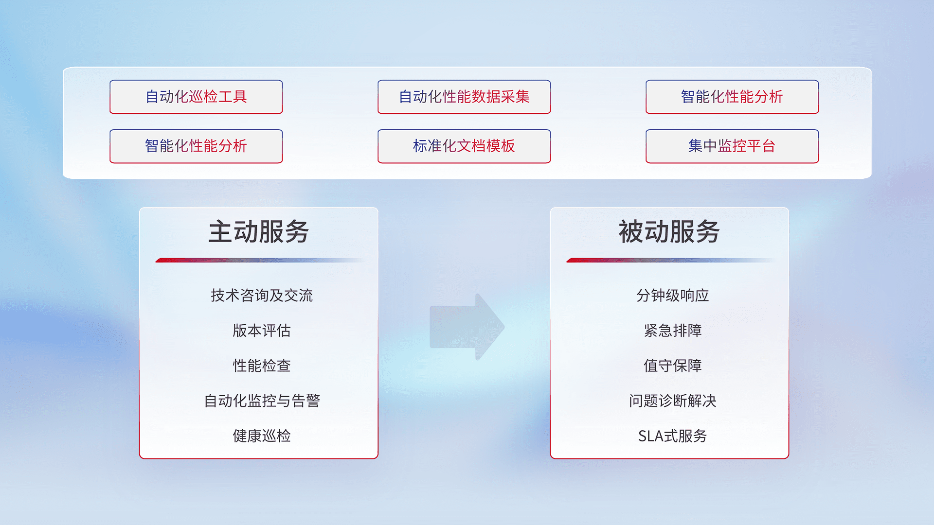 智能化工具和标准化文档,,保障服务质量,,,提供主动服务(包含技术咨询、、版本评估、、、性能检查、、、自动化监控与告警、、、健康巡检)和被动服务包含(分钟级响应、、紧急排障、、、值守保障、、、问题诊断解决、、SLA服务)。。。。