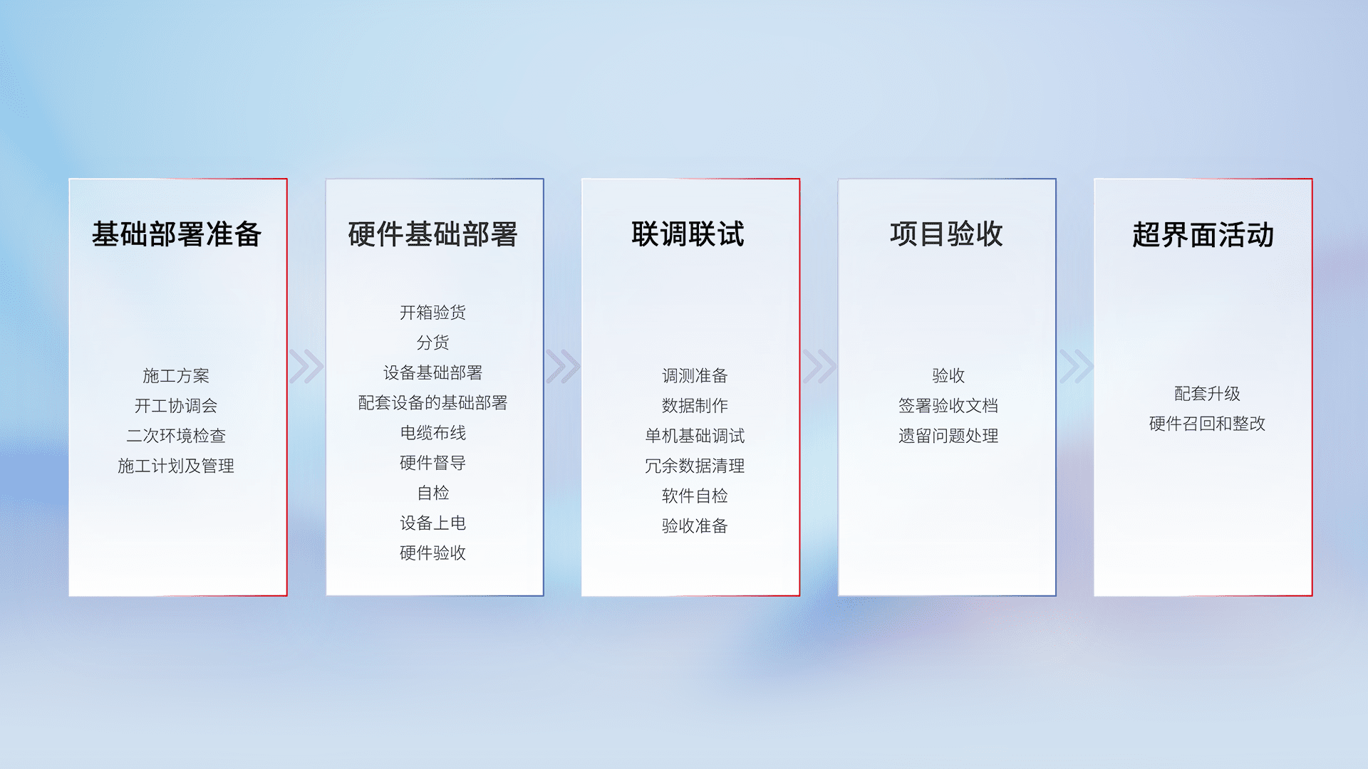 从基础部署准备、、硬件基础部署、、联调联试、、、项目验收、、越界面活动的全过程可追溯,,保证施工质量和进度。。。